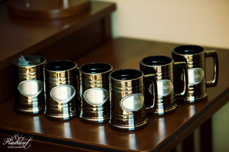 The groom on this big day, Jake, was doing a much better job of relaxing (not to say he didn’t have a few nervous jitters going on himself) but hung around with his groomsmen, drinking out of their engraved beer steins, and enjoying himself in the hotel room they used to get ready at before heading over to the golf course.