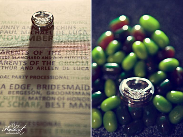 The details at the reception were really cute as well. They had a candy bar… not like a snickers bar, more like a trip to the candy store where you scoop various kinds of candy into a bag to take home as a wedding favor! The cool part about the candy bar (besides the fact that it was made up of delicious sugar) was that all the candy fit their color theme! It was all brown and green… and there are more green candies out there than I ever knew! This was quite a tasty and pretty little feature at their wedding!
